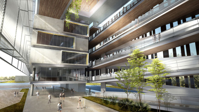 Os dois blocos são conectados por uma barra de apoio que abriga todas as circulações verticais e horizontais, além de sanitários e serviços de apoio. Entre os dois blocos articula-se um grande átrio, através do qual os dois blocos são conectados por rampas defasadas em meio nível, garantindo uma circulação fluida e contínua ao longo do edifício.