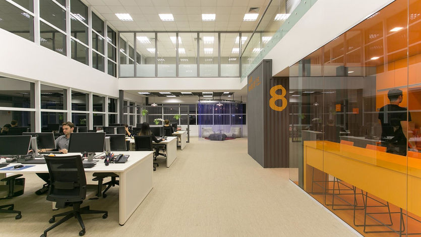 Além dos espaço de trabalho configurados no formato open office, o escritório conta com salas de reunião e áreas de descompressão espalhadas pelo espaço.